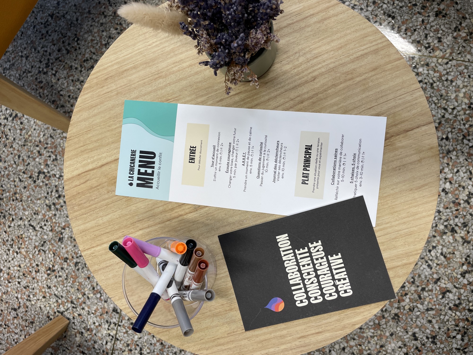 Le format de La Chicanerie est à l’image d’un restaurant : on réserve une table, on s’installe à deux ou en groupe, avec des amis ou avec des inconnus, et on nous propose un « menu » d'exercices. Entrée, plat principal et desserts sont assortis d’une thématique à aborder au cours d’une conversation.